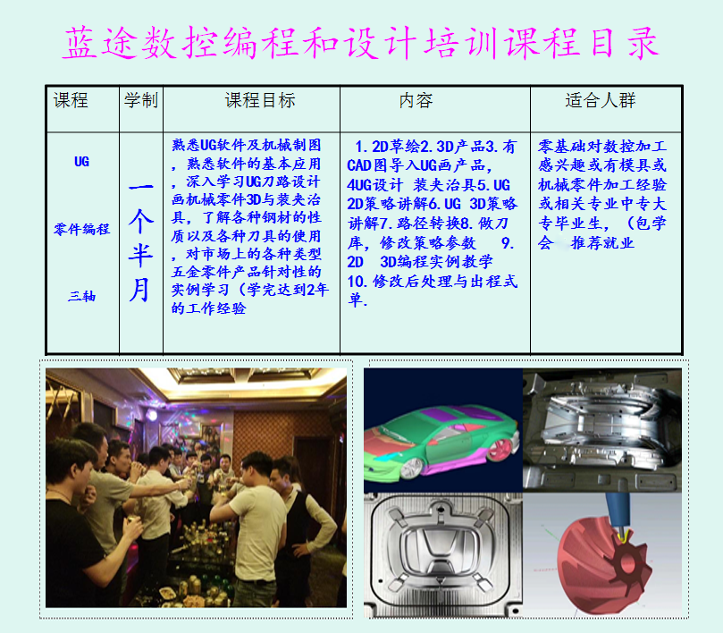 熟悉UG软件及机械制图;熟悉软件的基本应用;深入学习UG刀路设计;画机械零件3D与装夹治具;了解各种钢材的性质以及各种刀具的使用:对市场上的各种类型五金零件产品针对性的实例学习。(学完到达工厂2年工作经验)