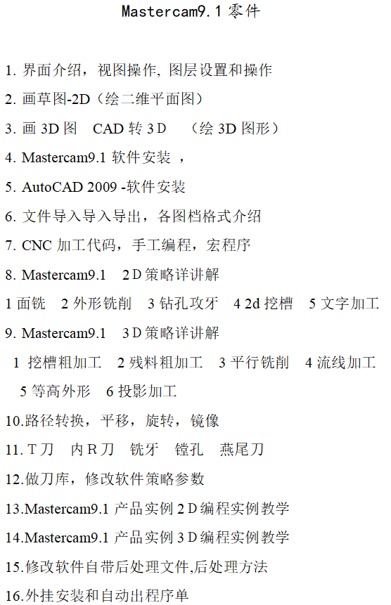 熟悉UG与MC软件及机械制图;熟悉软件的基本应用;深入学习UG与MC刀路设计;画机械零件3D与装夹治具;了解各种钢材的性质以及各种刀具的使用;对市场上的各种类型五金零件产品针对性的实例学习。(学完到达工厂2年工作经验)